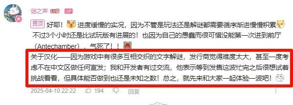 在UP主谜之声的视频下,他提到虽然《蓝途王子》的发行商一度因为本地化难度太大准备放弃汉化,但开发者表示他很想在发售初期忙完后“试着挑战看看”中文本地化,能否做到仍是未知数。