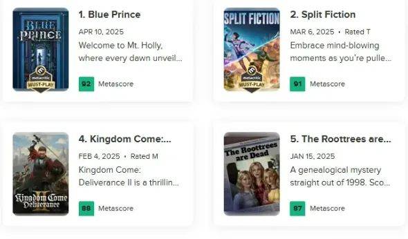 MetaCritic上今年最高分的游戏是什么?有些人可能会猜是《天国拯救2》,或是《双影奇境》,其实都不是。今年已经发售的游戏中,最高分(92分)属于一个名不见经传的独立游戏:《蓝途王子》(Blue Prince)。