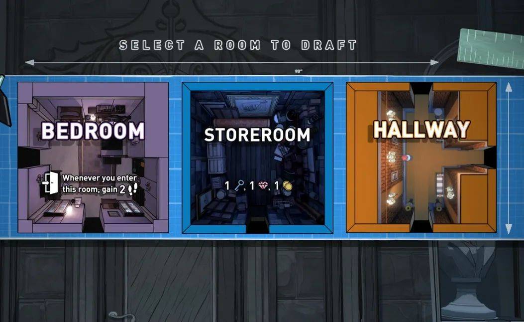 刚进入游戏时,玩家面对的是一张空白蓝图,可以通过消耗 “步数”、放置“房间”地块,不断接近终点。每通过一个房间,游戏都会提供3个随机的房间选项,不同的房间有着不同的开门方向,玩家需要结合所处房间的情况铺设出一条不间断的道路。