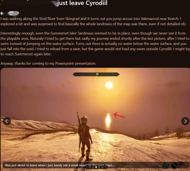 ·玩家沿着游戏中的斯金格拉德附近的河流散步时,发现可以探索地图之外的区域的空气墙漏洞,而且远远望去海的对面有着大量的疑似岛屿陆地,不过游到搬到还是失败了。