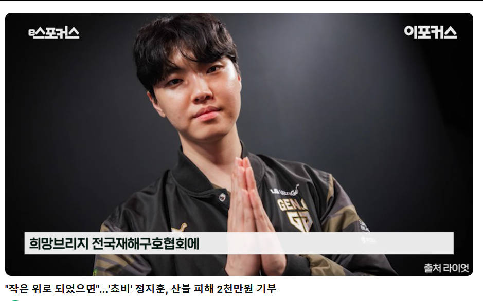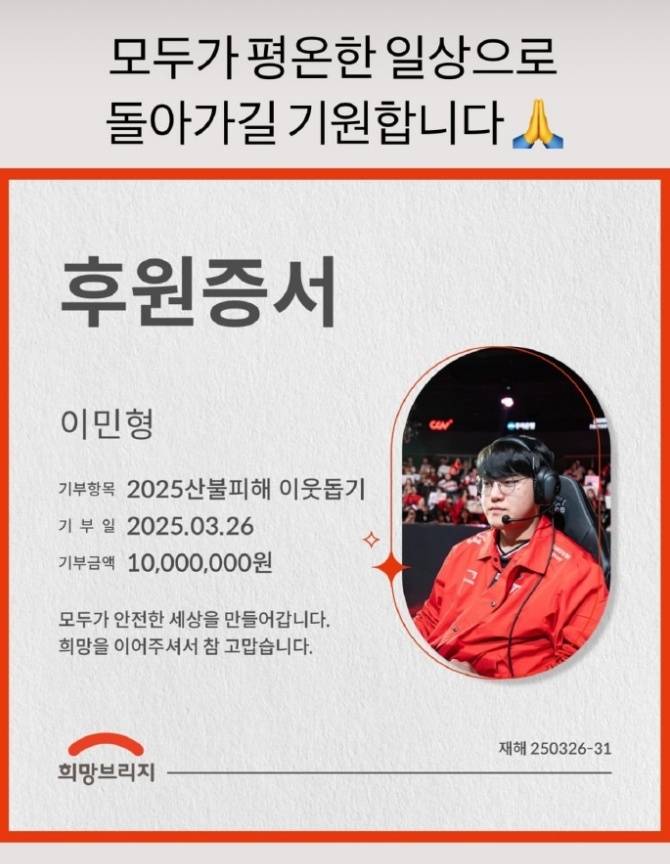 对此Oner选手经纪公司表示,“Oner选手为帮助因森林火灾失去家园的灾民,向希望桥全国灾害救助协会捐赠了2000万韩元。Oner选手从一开始就明确表露了捐赠意向,慎重考虑了捐赠处和方式。他真心希望这次捐赠能帮助到很多人。希望能给因突如其来的灾害而陷入困境的人们带来一点力量,尽快回归到日常生活中”。