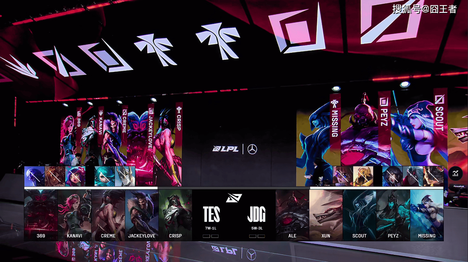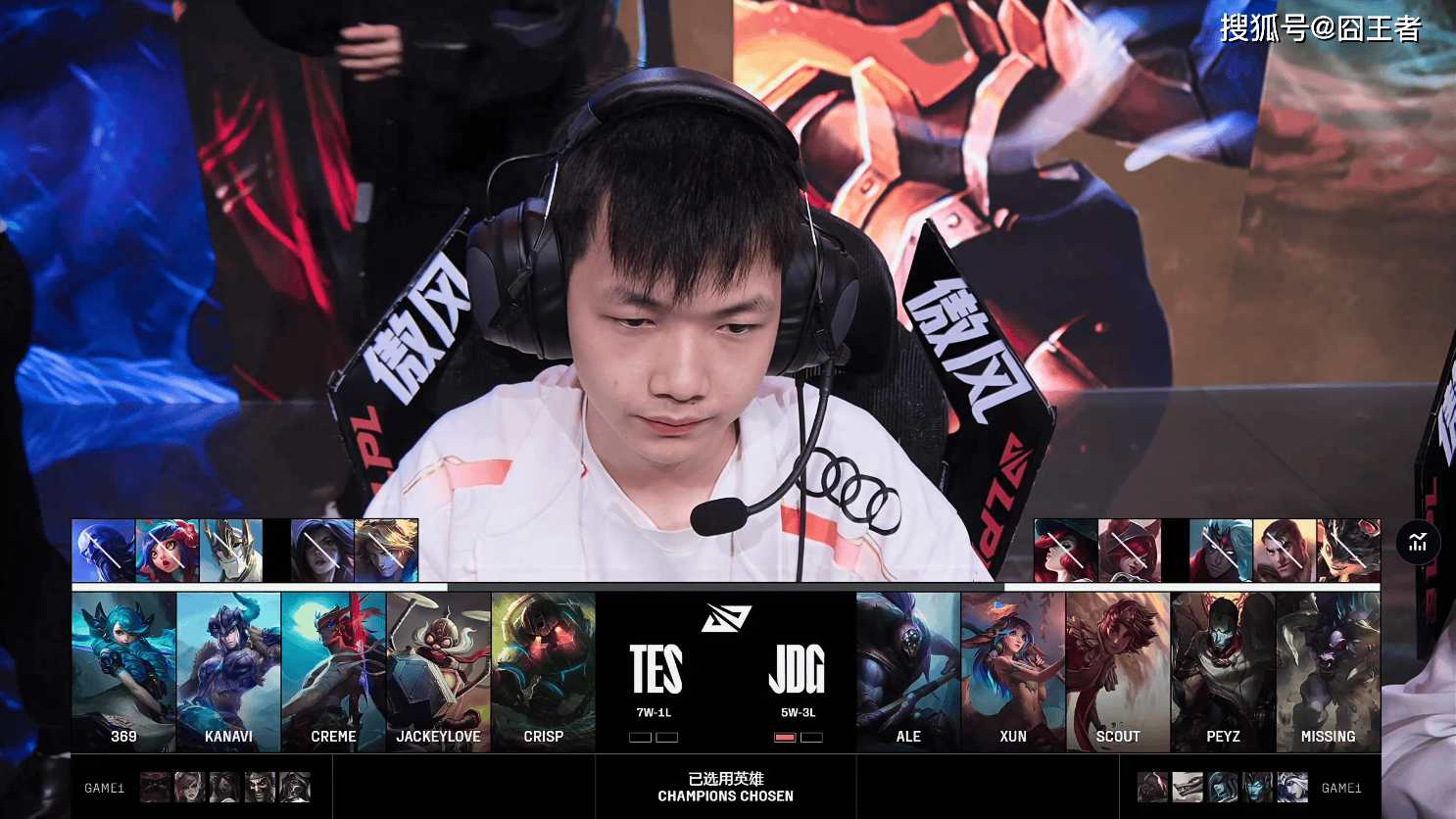 第一局比赛,TES蓝色方,禁用:瑞兹、岩雀、妮蔻、格温、加里奥,选用:369奥恩、Kanavi蔚、Creme阿卡丽、JackeyLove德莱文、Crisp烈娜塔;JDG红色方,禁用:兰博、韦鲁斯、狐狸、沙皇、阿萝拉,选用:Ale赛恩、Xun纳亚菲利、Scout丽桑卓、Peyz卡莉斯塔、MISSING寒冰