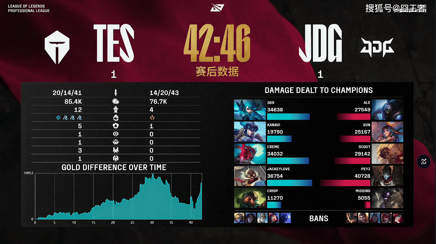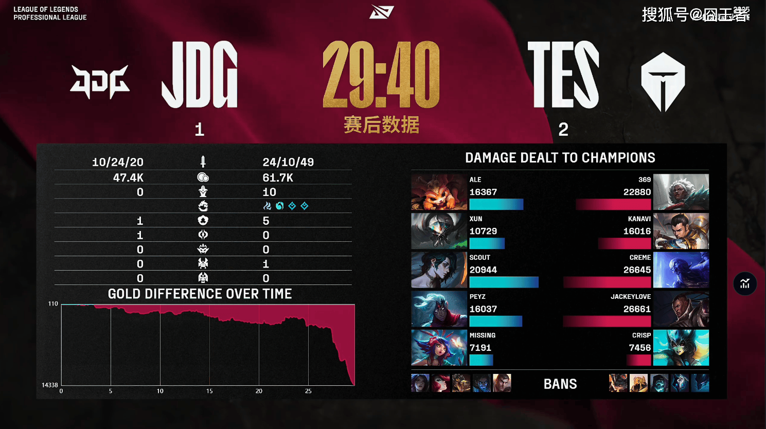 最终TES让一追二,战胜JDG,进一步保持积分榜第一的宝座;而JDG则是不幸遭遇失败,但还好输的是榜一大哥。