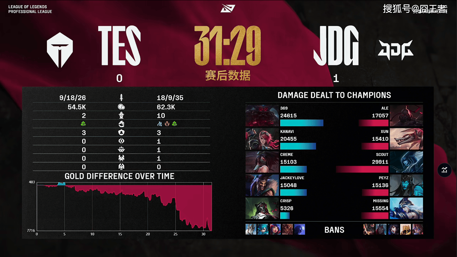 结果第一局比赛,被Scout的冰女五杀,JDG打出单方面碾压局啊。3分钟左右:Kanavi蔚率先发难,配合奥恩闪现撞飞赛恩拿下一血;5分钟左右:TES下路硬抗小兵对拼,Xun纳亚菲利赶到JDG打出1换2;11分钟左右:奥恩羊来被Peyz闪现躲掉,MISSING寒冰反手R中蔚完成击杀;15分钟左右:TES4人抓上强越赛恩,JKL德莱文晚来一步未能收下人头;20分钟左右:369奥恩关键顶飞纳亚菲利完成终结,TES拿下小龙;22分钟左右:Kanavi蔚Q闪失误,Xun纳亚菲利赶到拿下双杀;25分钟左右:Kanavi蔚孤军深入,JDG0换4拿下厄塔汗和大龙;最终31分29秒:Scout冰女五杀,JDG一波结束比赛。