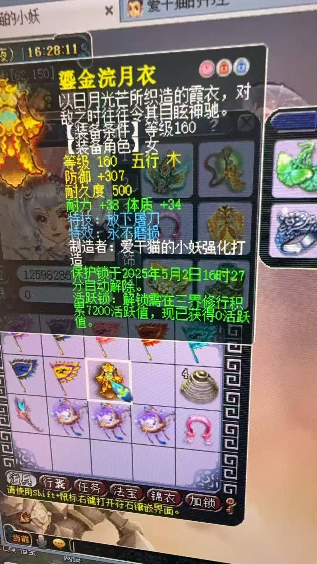 一位幸运玩家在鉴定装备时,获得了一件160级双蓝字女衣。这件女衣拥有307点初始防御,体耐双加72点,还拥有特技放下屠刀,以及永不磨损特效。但就这件衣服的属性来说,已经能跻身高端pk装备的行列,永不磨损特效让这件衣服锦上添花,再怎么用也不心疼耐久了。