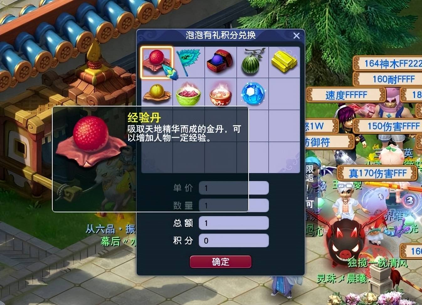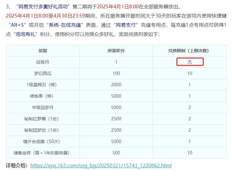 在本周二维护后,官方推出了“泡泡有礼”充值活动。在活动期间,通过网易支付每充值1点专用点,即可获得1点“泡泡有礼”积分。积分可用于兑换绑定星辉石,绑定修炼果,秘制红蓝碗,境外旗等游戏道具,除经验丹以外,其他道具的兑换都有一定的次数上限。