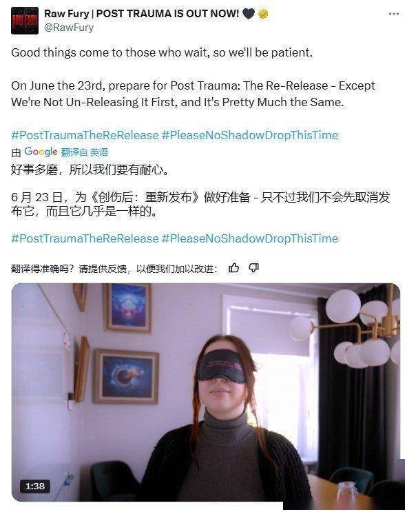 Red Soul Games至少还能苦中作乐,其在推特发布视频宣布将6月23日定为“精神发售日”,计划通过直播和赠品活动“重新发售”游戏。该作并未下架,仍保留在所有已登陆平台,但工作室试图调整节奏继续推广《创伤后》。