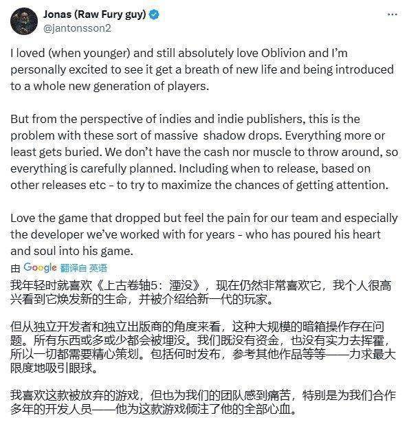 发行商Raw Fury创始人Jonas Antonsson为Red Soul Games发声,解释称突袭式发售会导致“其他游戏基本被淹没”。他表示:“我们没有可供挥霍的财力或资源,所有环节都经过周密计划,包括根据其他游戏发售档期来选择发布时间,以争取最大曝光机会。”尽管Antonsson坦言自己年轻时沉迷过《上古卷轴4》,但他更心疼“团队,特别是合作多年的开发商——他将全部心血都倾注在这款游戏中”。
