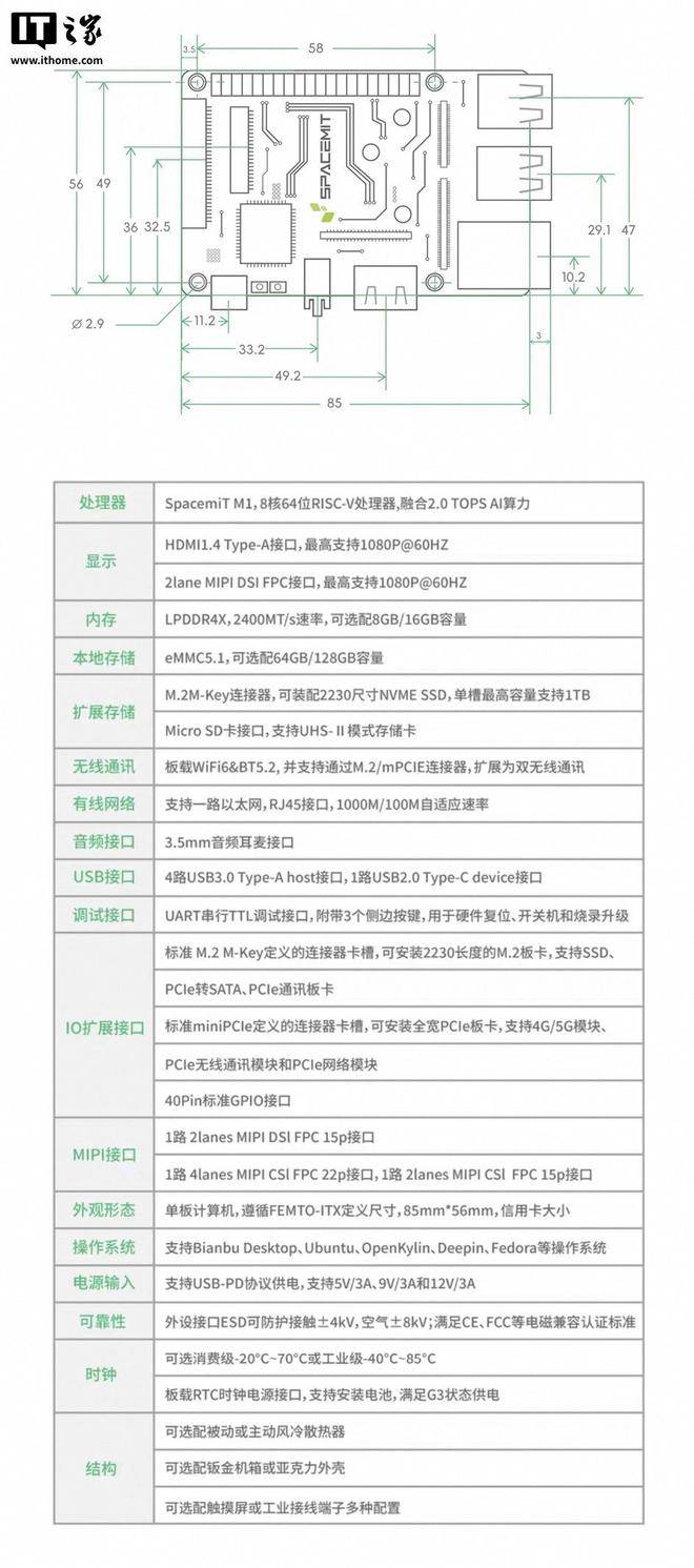 根据官方所述,该单板电脑采用进迭时空 M1 SoC,内置八核 CPU 和 2 TOPS 算力的 NPU,可优化 AI 应用的表现;在内存方面有 8/16GB LPDDR4X 板载内存可选,内置存储为 eMMC 4.1,容量可选 32/64GB。