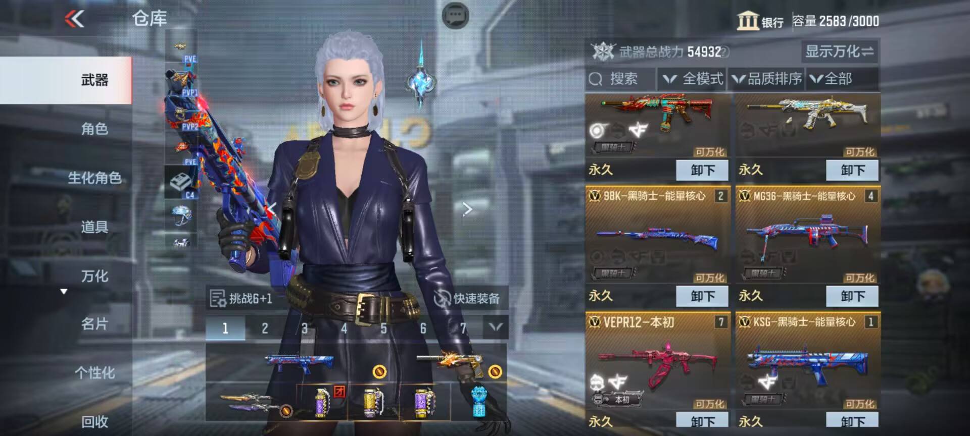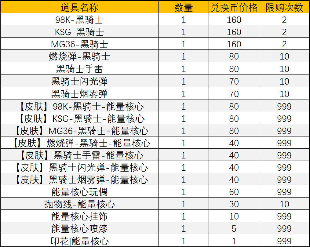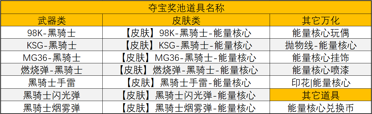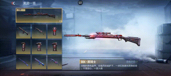 奖池中有98K-黑骑士、KSG-黑骑士、MG36-黑骑士等主武器,它们的能量核心皮肤也均会返场。98K-黑骑士是一款优秀的轻狙,自带消音器并拥有出色的操控性能;KSG-黑骑士拥有弹片定向射出技能,打击敌人时可提高较为稳定的输出;而MG36-黑骑士的开镜精度极高,非常适合在各模式中守点输出。