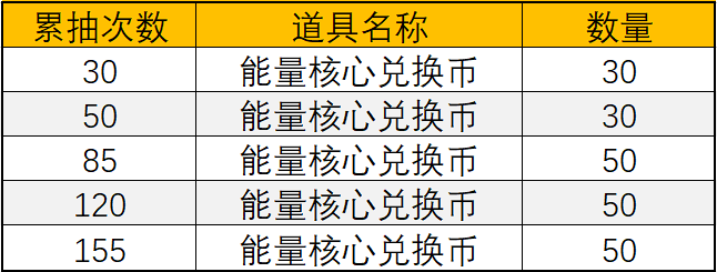 能量核心兑换币不够用?别忘了累抽奖励哦~累计一定抽奖次数后,记得前往活动界面右侧领取相应的能量核心兑换币,能帮你节省不少钻石呢!下图是累抽次数对应的能量核心兑换币数量: