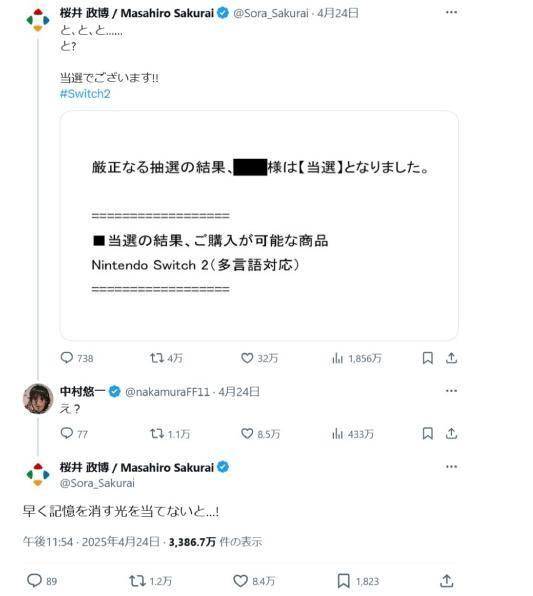 正在为Switch 2开发《星之卡比》新游戏的樱井政博日前发推,欢呼庆祝自己抽中Switch 2首轮购买权,不过曾经合作过多次的声优好友中村悠一已经威胁自己没抽中要和抽中的好友绝交,看看他如何应对的。