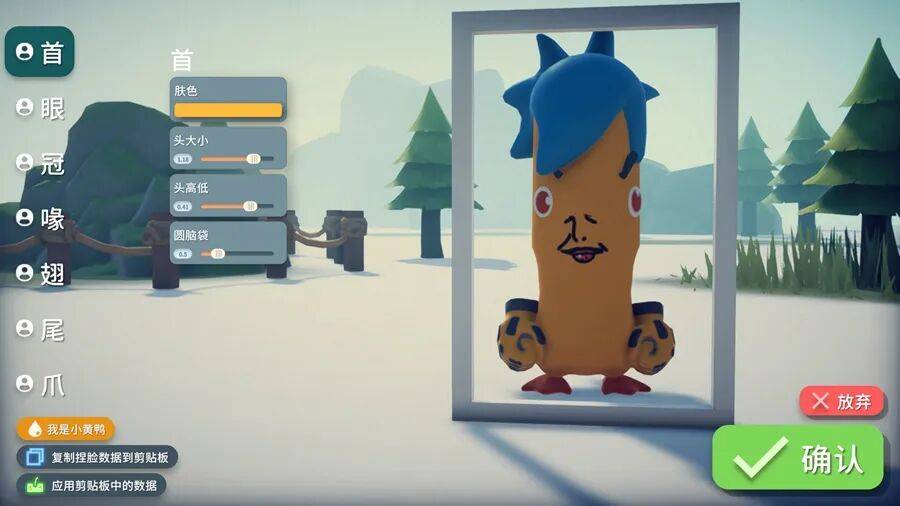 圆润的角色建模,提炼出鸭子大眼、短喙、小尾巴的特征。内置捏脸编辑器允许我进一步加入更夸张的元素,将鸭子塑造得憨态可掬。