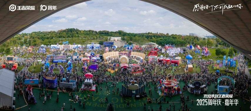 晚会精彩,嘉年华同样热闹。今年,十周年游园会正式升级为首个《王者荣耀》嘉年华,于25、26两天在成都露天音乐公园打造了总面积超过6万平米的超大会场,包含6大主题区域和体验路线,吸引共超5万人到场参与现场活动。