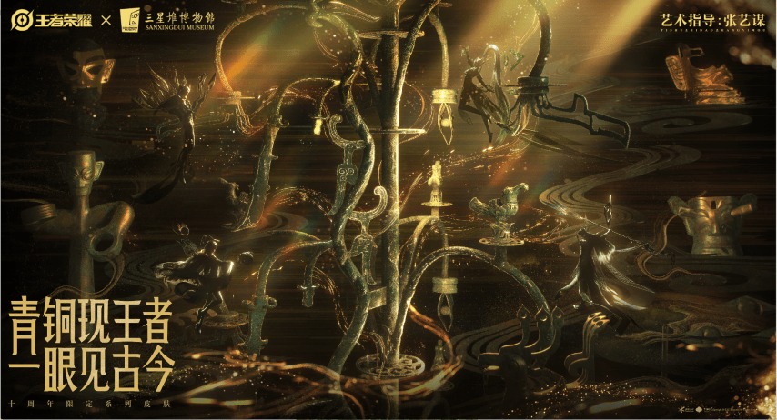 回首过去十年,作为国产自研原创代表IP,《王者荣耀》始终立足于中华文化土壤,持续以数字科技的优质内容传承传统文化。在十周年期间,《王者荣耀》与三星堆博物馆深度合作,并邀请张艺谋导演作为艺术指导,推出“女娲-万灵启世”、“后羿-神树通天”、“杨戬-纵目迁山”、“少司缘-巫礼祀神”四款十周年限定系列皮肤,透过面具古今回望,感知先祖们非凡的想象力和蓬勃的生命力。