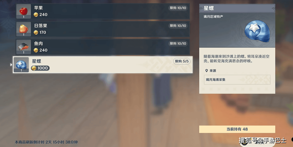 刷新周期:商人的星螺库存每 72 小时(也就是 3 天)会自动刷新一次,建议设置日历提醒定期前往购买,积少成多能显著减少采集压力。