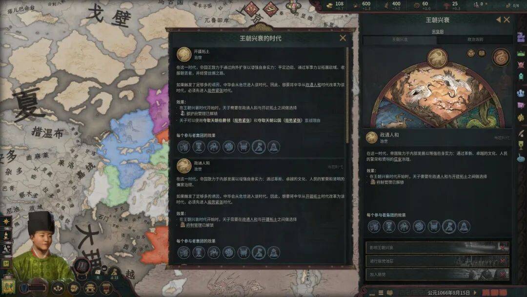 例如在“政通人和”的局势下,皇帝无法亲自发动对外战争,只能通过大型工程中的“开边”决议来给手下的封臣制定战略目标。这也就意味着玩家在这个阶段需要将主要的精力放在国家的内政上,在这个局势下玩家拥有许多内政治理相关的BUFF,用来模拟“治世”,对于喜爱种田的玩家来说可以好好过一把建设瘾。