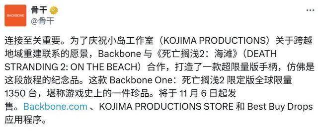 游戏外设制造商Backbone于10月31日宣布,将推出该公司销售的游戏控制器"Backbone"与《死亡搁浅2:冥滩之上》的联名款。