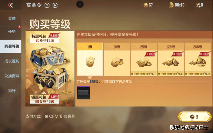首先是游戏商城,可以直接使用购买部分指定武器道具,心仪的武器轻松抱走。也可以用来购买赏金令等级,助力你快速升级拿奖励,解锁USP-仲康以及威虎碎魂刀等赏金令武器。