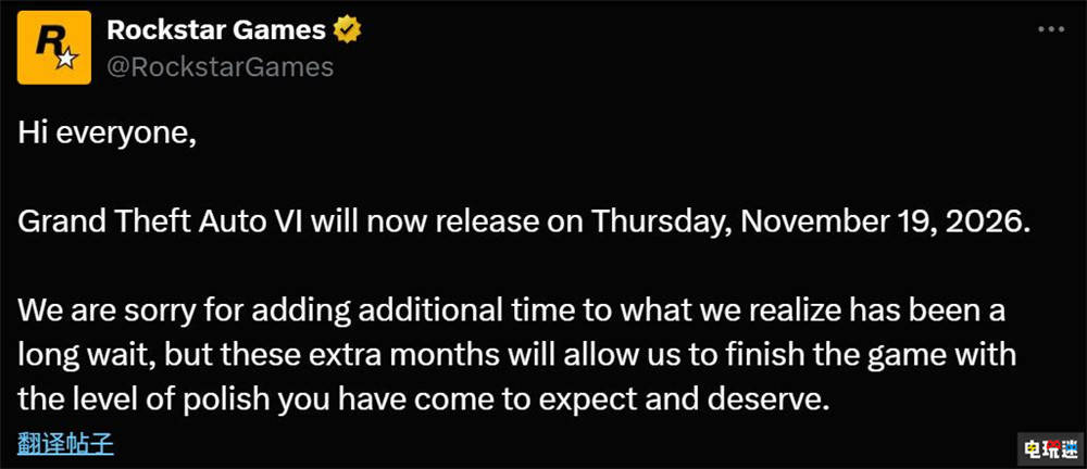 R星官方对于此次《GTA6》跳票道歉。他们很抱歉要让大家等待更长时间,但是这额外的几个月将使开发团队能够以玩家期待与应得的精良水平完成这款游戏。
