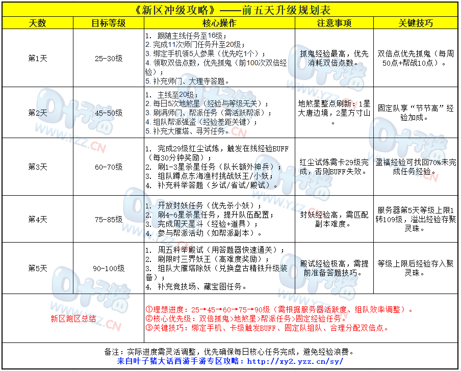 每日任务必做师门、五环、宝图、地煞、妖王,可以获得大量的银两和奖励道具,抓鬼经验最高,地煞需蹲点抢怪,奖励丰厚但也看运气。具体新区前五天冲级规划表,大家可以按照上面的表格来安排。