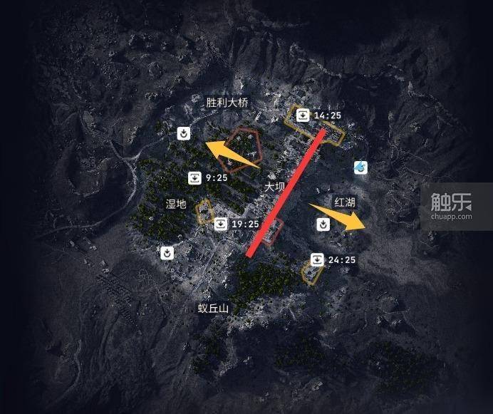 图为“大坝战场”地图:红线为高层“大坝”区域,内部充满可探索要素,同时它又起到为两侧低地区域进行风格分割的作用