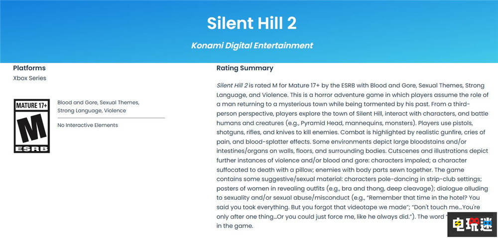 此前ESRB游戏评级信息中《寂静岭2重制版》仅包括PS5与PC版本,游戏ESRB评级为“M级”(17+),游戏中包括血腥、暴力与粗话等内容,如今Xbox Series X|S版本也给出了同样的“M级”评级。