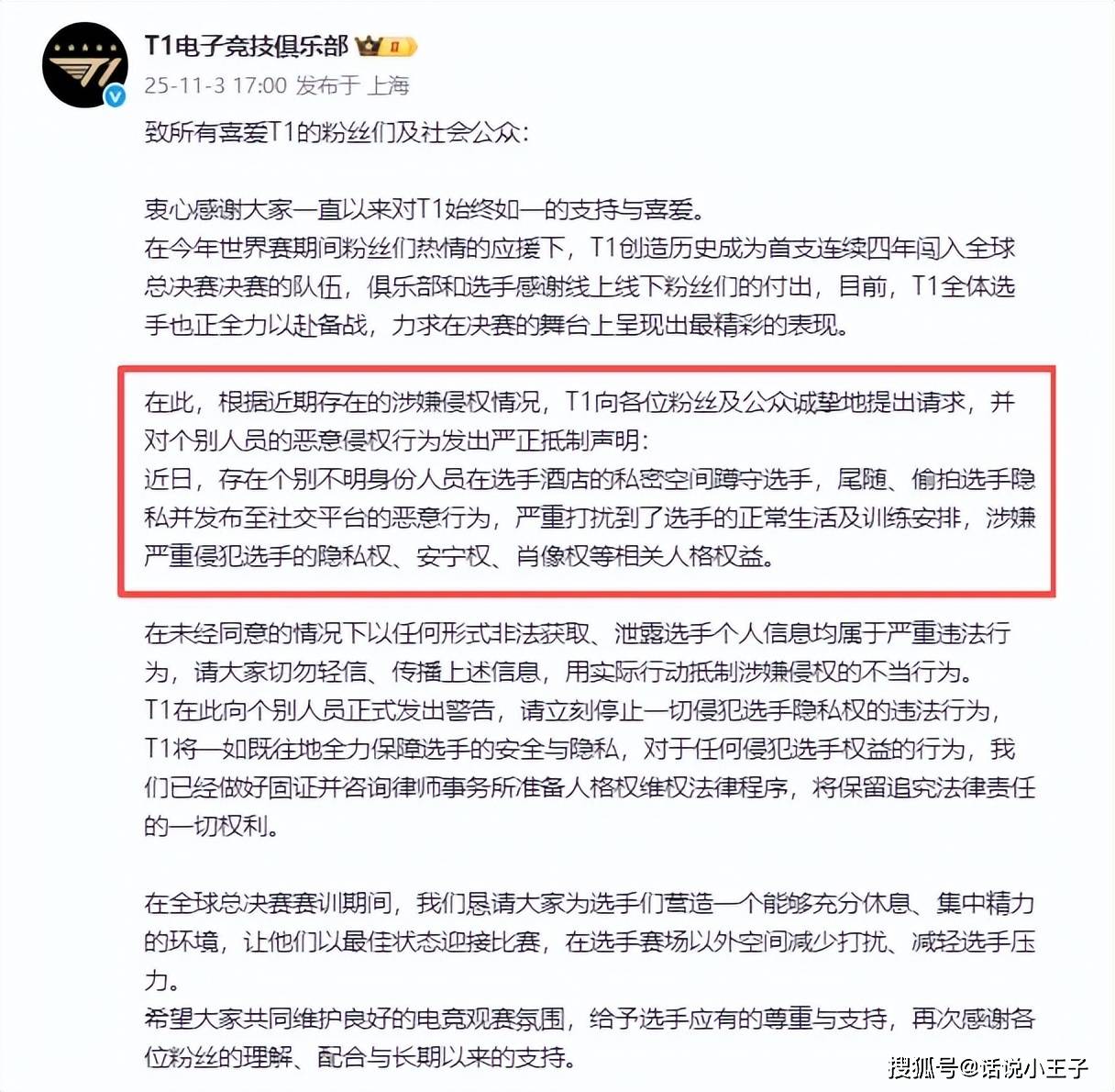 T1官方就发布声明,个别不明身份人员在酒店私密空间蹲守选手、尾随选手、偷拍选手,严重干扰到了选手的正常生活以及训练安排。现在T1正式向个别人员发布警告,立即停止侵犯选手隐私违法行为。希望在世界赛期间能够为选手营造出一个有充分休息集中精力的环境,让他们以最佳的状态去迎接比赛,希望粉丝们可以减少打扰,减轻选手压力。