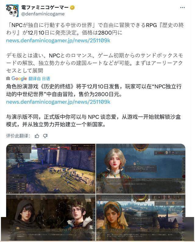 独立游戏开发商Tatamibeya宣布,沙盒模拟RPG《历史的终结》将于今年12月10日推出抢先体验版,支持简体中文,登陆PC Steam。