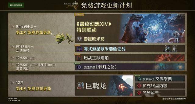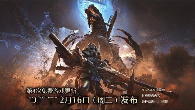 《怪物猎人:荒野》第四次免费游戏更新将于今年12月16日(周二)上线,本作首个远古龙“巨戟龙”届时将登场。上次免费更新(第三次更新)于今年9月29日上线,当时和SE网游《最终幻想14》展开了特别联动。