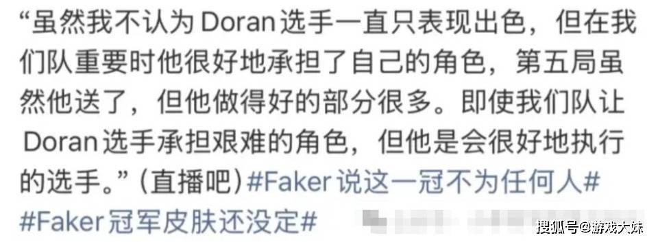 赛后,Faker高举第六座世界冠军奖杯,世界赛助攻数据也突破千次,属于他的传奇再次被写进神话,无论时间如何更迭,他依旧是那个屹立不倒的“中路之神”,然而,在无数人欢呼与泪目的瞬间,T1这次夺冠的旅程中,也有一些令人啼笑皆非的小插曲——比如“Doran青钢影事件”。