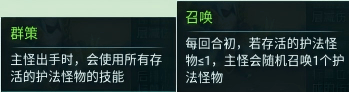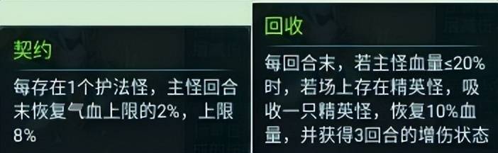 而随机特性的契约,是说明护法能为主怪恢复血量。而回收特性,则是主怪能吸收场上的精英怪,恢复10%血量,并获得3回合的增伤状态。