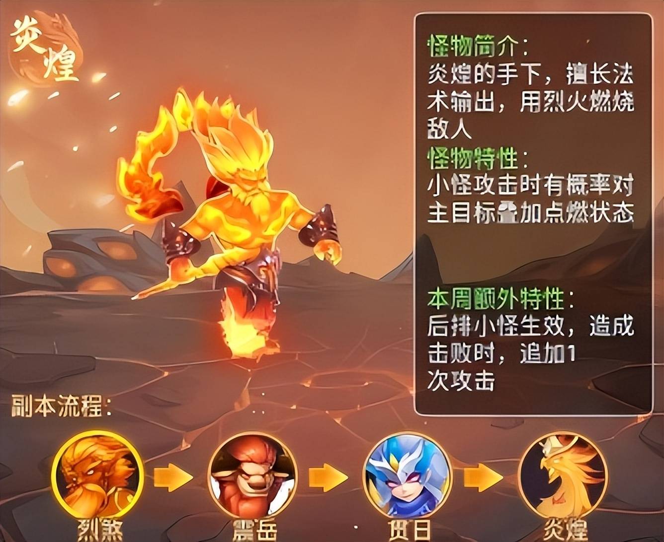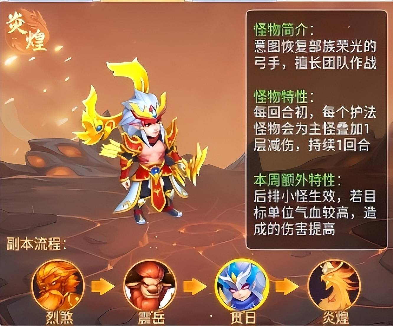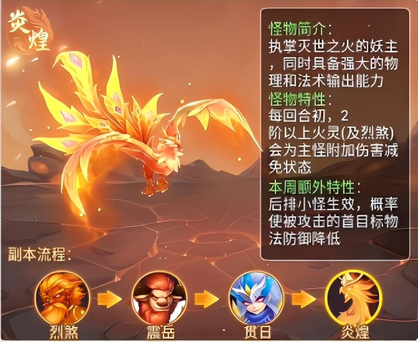 终于来到最后一关,这也是副本最难的阶段。主怪名为炎煌,具备物理和法术输出能力,其特性数量也是最大,效果也是最强大的。