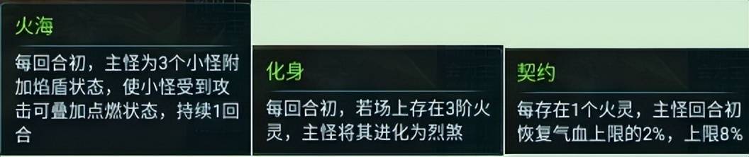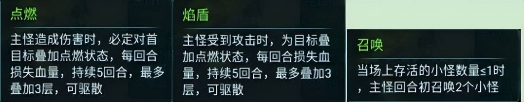 同样需要大家注意的是,每回合初,2阶以上的火灵(及烈煞)会为主怪附加伤害减免。而后排小怪则概率使被攻击的首目标物法防御降低。