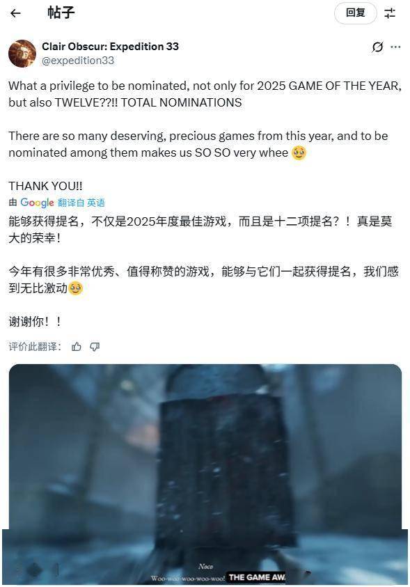 在TGA提名发布后,《光与影:33号远征队》官方在社交媒体X上发文致谢。