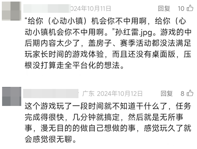 其实业内类似的案例不少。去年《心动小镇》上线后,还没几天,评论区画风就变成了:“玩一会就不知道干啥了,任务几分钟搞定,然后就是无尽的空虚。”