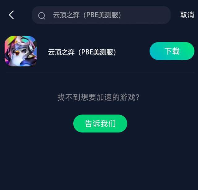 接下来,我们就可以进入到APP内搜索云顶之弈PBE美测服,在这里可以一键获取并加速游戏,如果没有拳头账号的玩家们还可以在这里获取账号。苹果手机用户可能会提示需要海外ID,我们按照步骤操作即可。