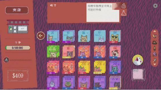除此之外,《双喵成行》还设有5类精华和18种不同的升级效果。精华是提升玩家卡组实力的核心机制,能够为卡牌添加额外的增益效果,例如“平衡精华”能够随机让卡牌在结算时获得金钱或行动数,而“欢欣精华”则会直接让卡牌获得分数倍率。