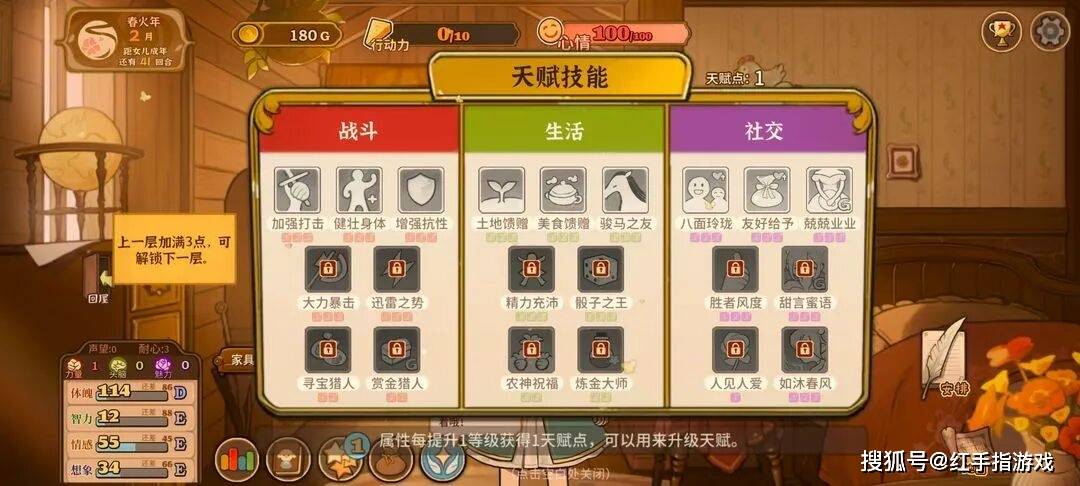 新手平衡流:先点绿色生活系第一层(种田 + 每日体力增加),再点红色战斗系第一层(防御提升),最后解锁田地扩充,适配一周目探索。