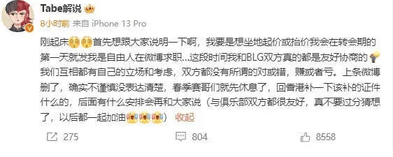 直到后来BLG管理层在粉丝群公开回应,直言Tabe在“坐地起价”,利用队伍已经拒绝其他教练、手上存在空缺的时机向俱乐部提额外要求,BLG的说法虽然没有官方声明的正式,但在圈内却引起大量震荡,面对指责,Tabe删除相关微博,并解释只是“立场不同,不存在对错”,然而,一旦风声传出,就很难再完全抚平质疑。