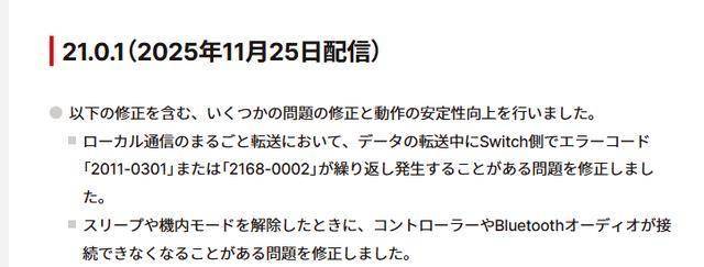 11月25日今天,任天堂宣布Switch 2最新系统更新21.0.1上线,修复影响玩家体验的已知问题,建议玩家尽快更新以获得更好体验。