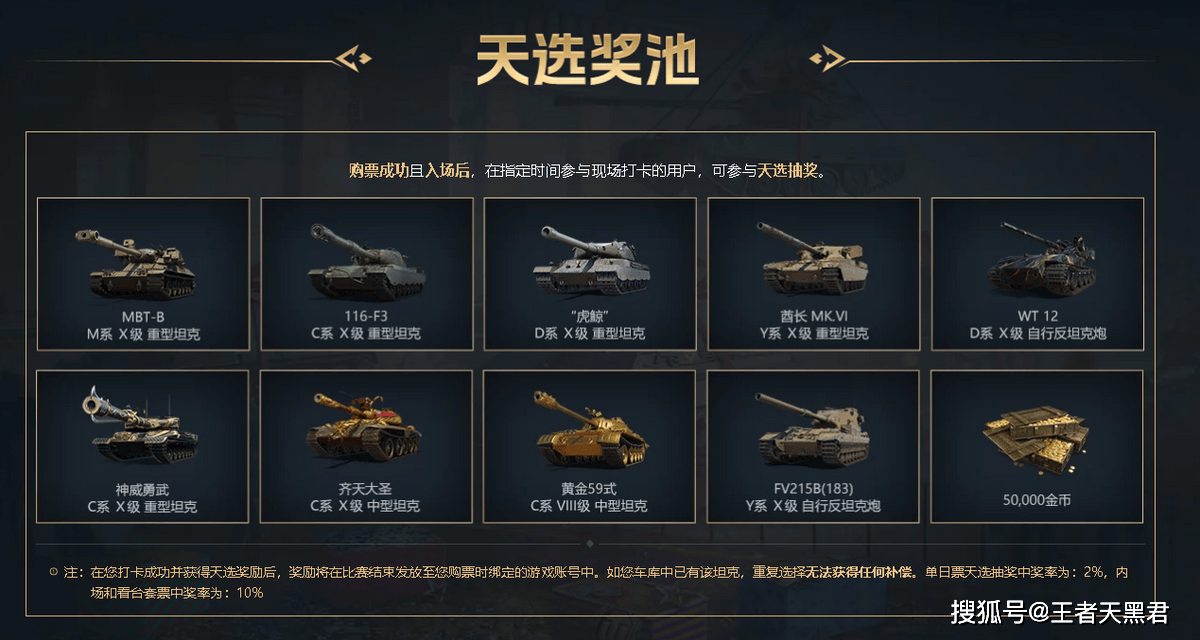 而为了进一步调动场上气氛,官方也在战斗间隙开启了抽奖活动。像被天选奖池选中的话,就可以自选国服的传奇坦克黄金59,还有虎鲸等一众十特,甚至还有整整5万金币,够用一年!
