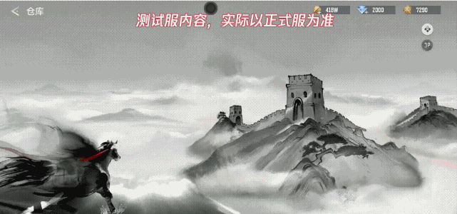 首先是仓库展示。点击仓库中的武器“M4A1-仲达-烽火连城”,系统将自动播放CG动画。画面中可见八百里加急的战马疾驰而过,与此同时,长城沿线的烽火台依次点亮——这是中国古代特有的信息传递方式,预示着战争的临近。