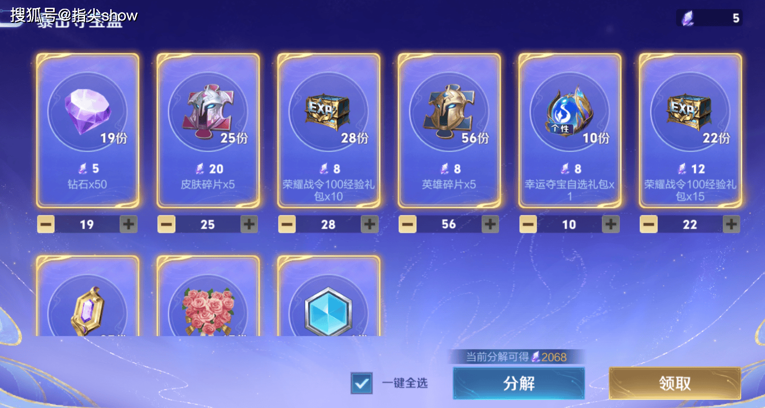 分解的内容可以参考上图,除了英雄、皮肤和荣耀水晶,你抽到的一切道具都可以分解,最值钱的就是皮肤碎片*5了,可以分解20个夺宝碎片,只是不知道换一个个性资源需要多少。
