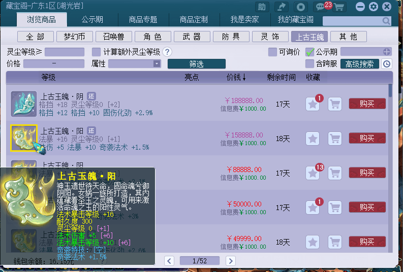 小生第一时间查看了区内玉魄上架情况,发现已有足足52页在售玉魄。其中既有适合日常任务的大众玉,也不乏属性极品、携带奇袭法术的PK专属玉。至此,玉魄正式迈入藏宝阁大交易时代。