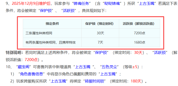 本周维护公告内容可谓“炸裂”,其中明确:藏宝阁现已支持寄售上古玉魄及五级以上的五色灵尘。不过需要注意的是,此后完成魂铸任务所获得的玉魄,若满足图中两项条件,将分别增加30天与7天的时间锁。