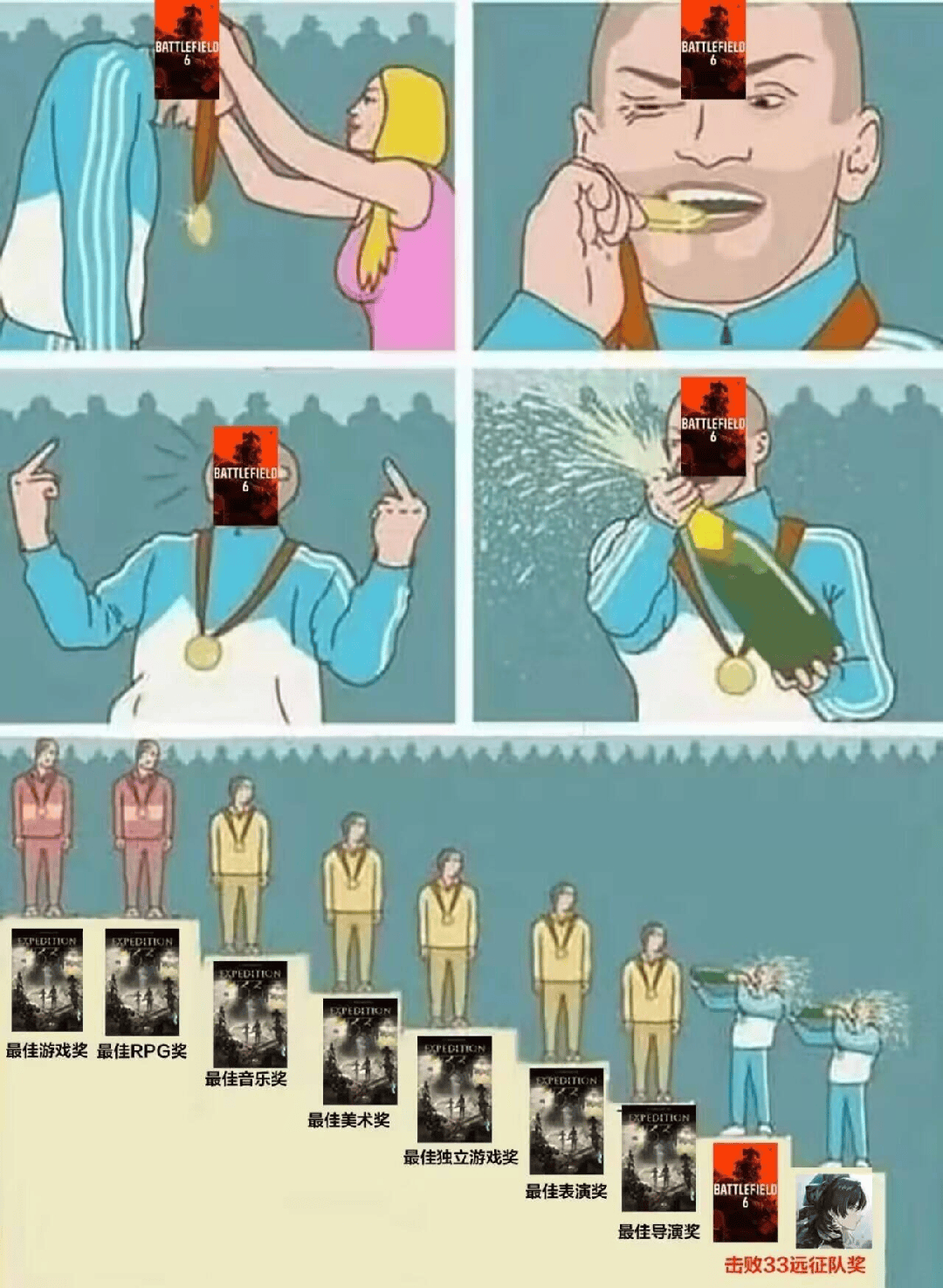 反倒是在最佳音效设计角逐中击败 33 号远征队的战地 6,以及拿下玩家之声的鸣潮,这两个游戏被大伙做成了梗图,莫名其妙在各个群里流传,就很乐。