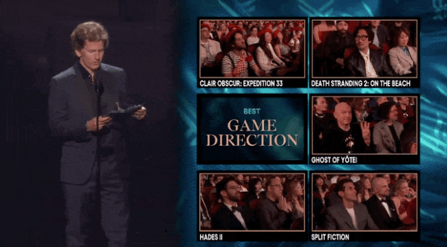 没错,我说的就是小岛秀夫,岛哥哥在台下坐如喽啰,似乎被打击到麻木了。33 号远征队拿下最佳游戏指导奖,他都被气笑了。