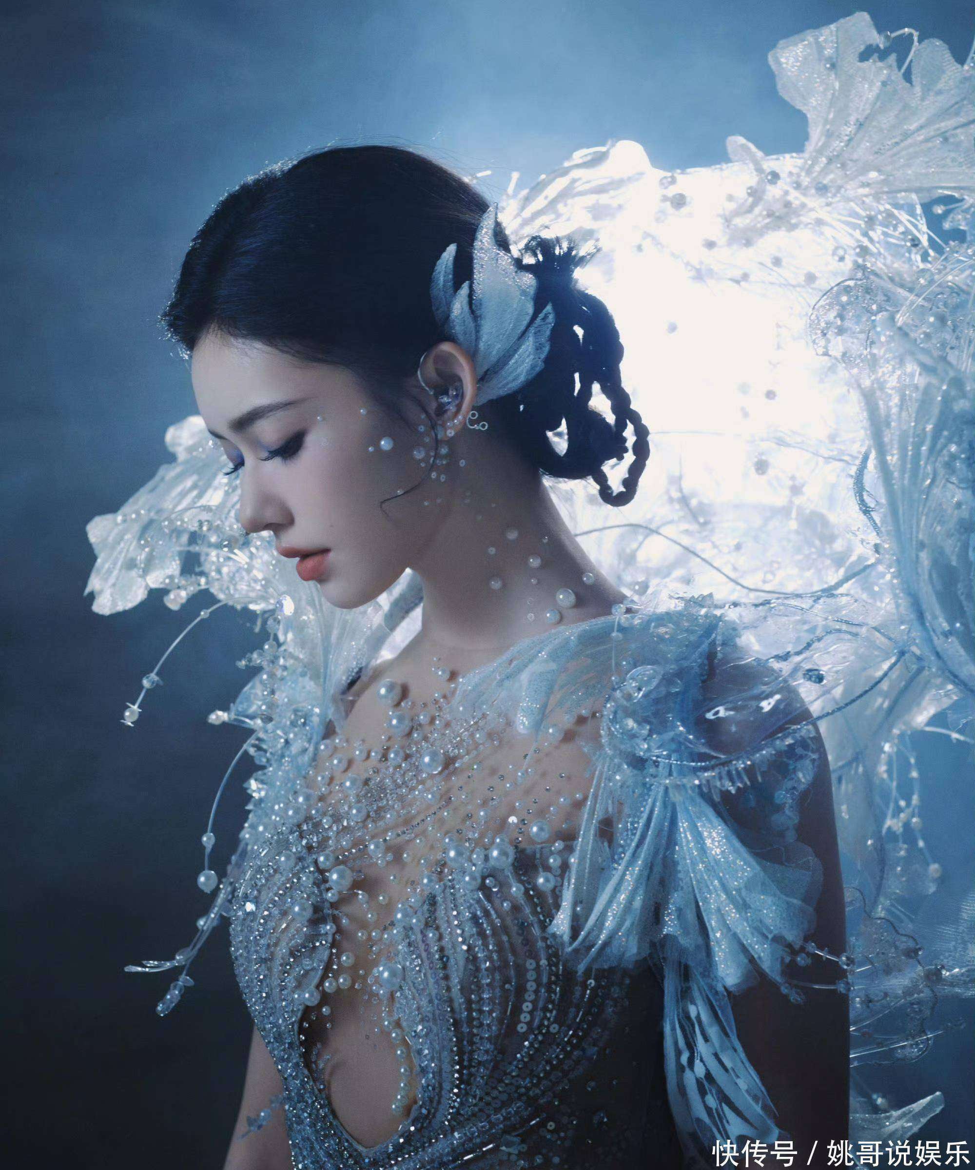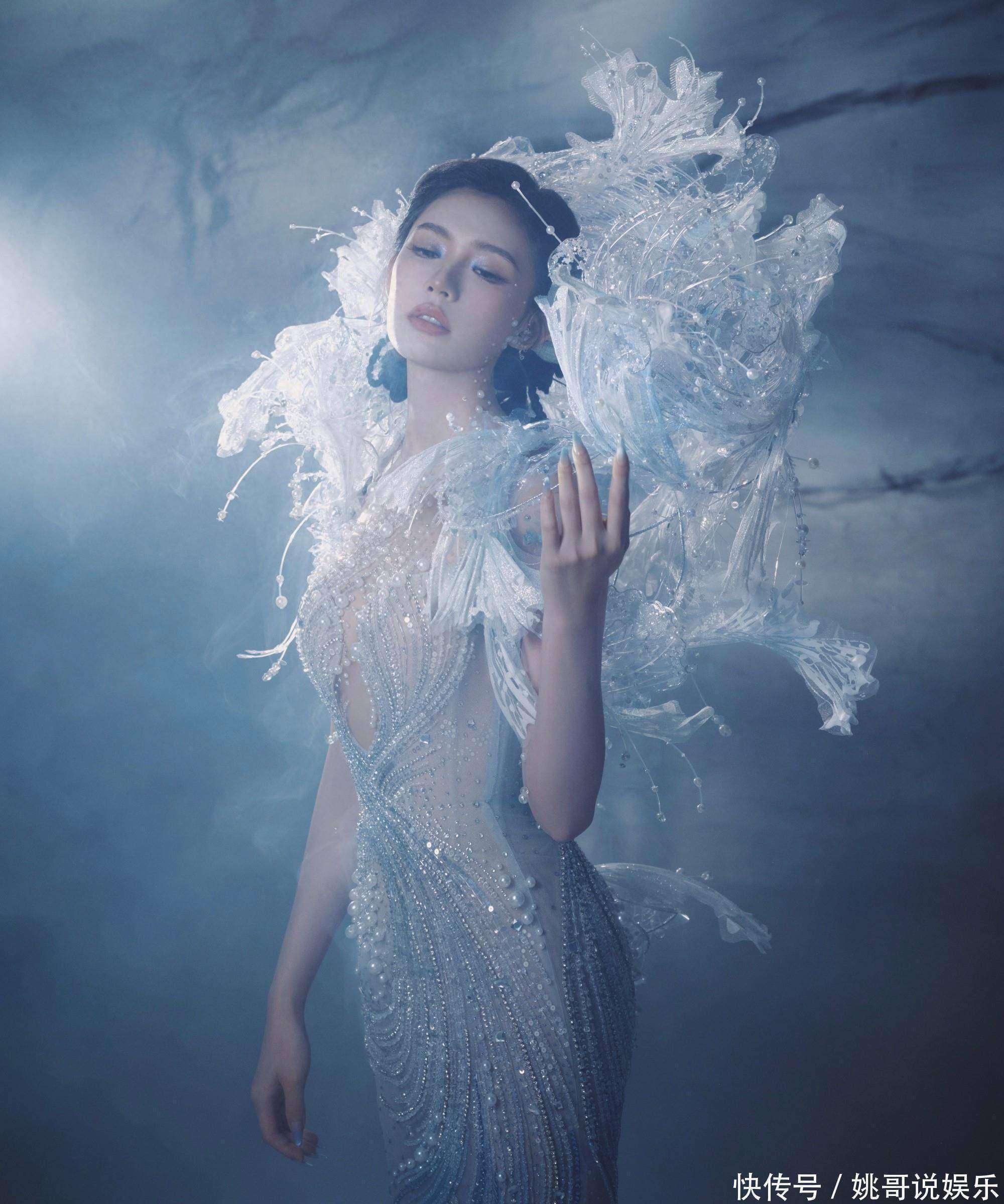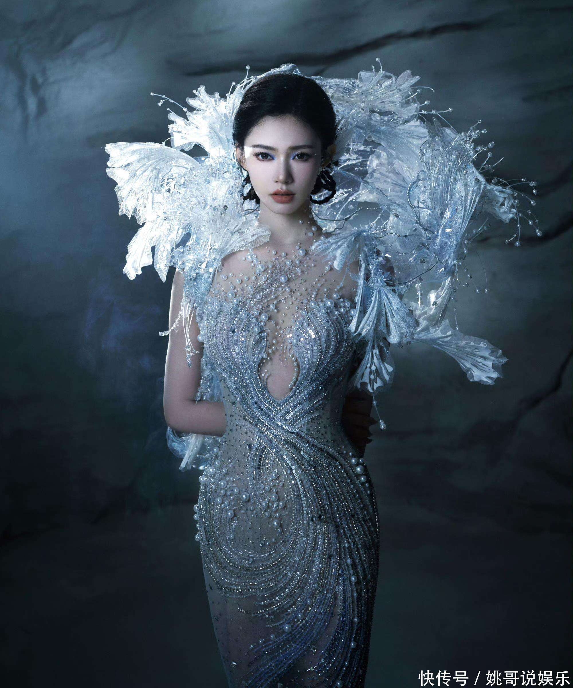 肩部的冰晶装饰如同寒冬里的霜花,透明的层次感和裙身的璀璨相得益彰,仿佛从深海中走出的冰雪人鱼,将冷冽的破碎感与无尽的美丽巧妙结合。