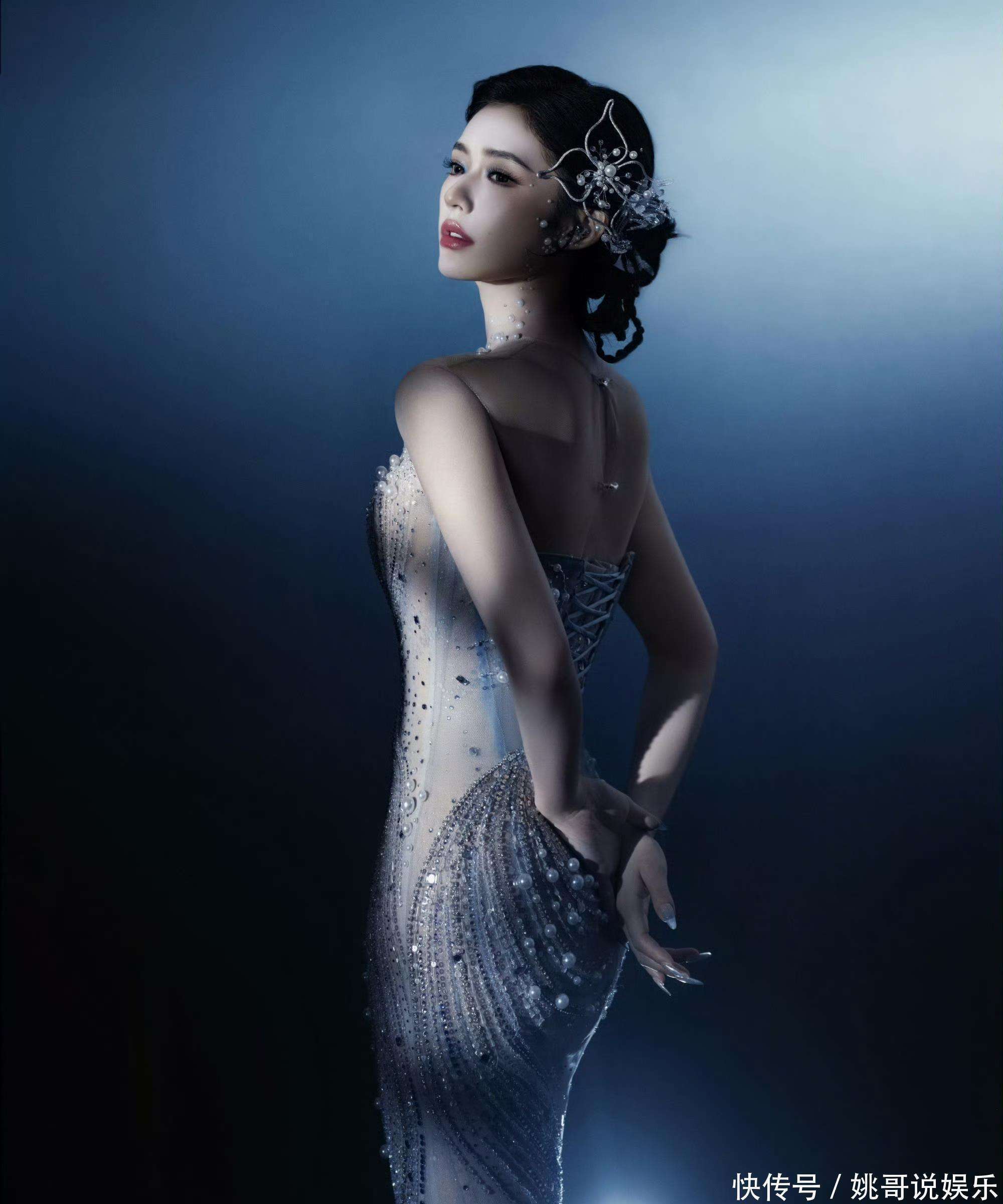 她身穿一条银蓝渐变的鱼尾裙,宛如海底的光辉,裙面上点缀着细小的钻石和珍珠,像是无数星光洒满海面。流线型的裙身贴合她的曲线,突显出完美的身形,轻薄的纱料与闪烁的钻饰交织在一起,在冷色调的灯光下,散发出层层闪耀的光泽。